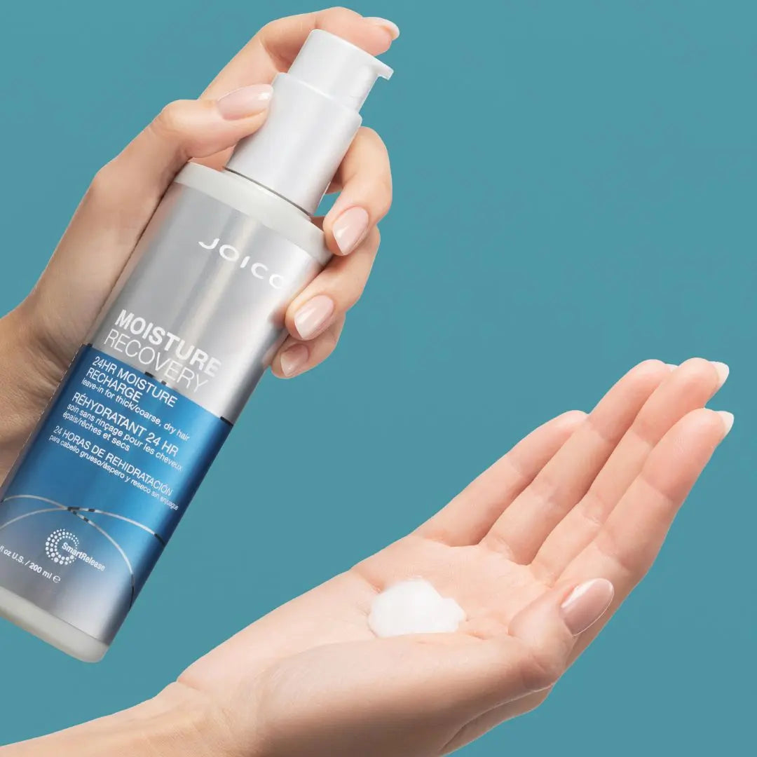 Objavte intenzívnu dávku hydratácie pre suché, silné a hrubé vlasy. JOICO Moisture Recovery Recharge je ľahký bezoplachový krém, ktorý okamžite rozčesáva, vyživuje a dodáva vlasom zamatovú hebkosť aj viditeľný lesk. Vďaka 24hodinovému účinku chráni vlasy pred krepatením a vysušením, zatiaľ čo ich zanecháva poddajné, hladké a zdravo vyzerajúce.